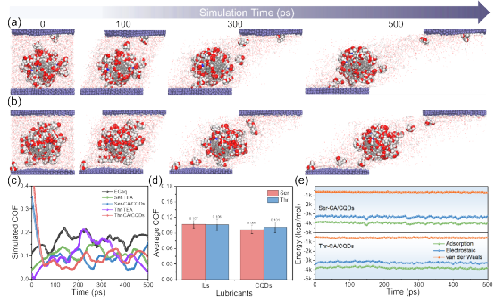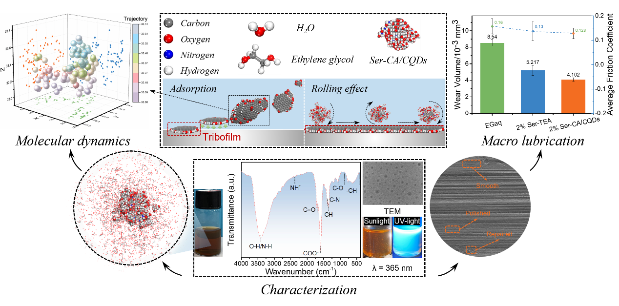 团队在《Carbon》期刊(影响因子IF=11.3)连续发表两篇高水平研究论文。第一篇题为《Macroscopic tribological properties and molecular simulation study of carbon quantum dots modified by ionic liquids》(离子液体修饰碳量子点的宏观摩擦学性能及分子模拟研究),由杨朝钊博士生作为第一作者。研究通过一锅热解法成功制备出表面由离子液体修饰的碳量子点,实现了纳米颗粒均一尺寸(约 2.2 nm)和长期分散稳定性的突破。实验结果显示,在水基润滑体系中加剂量为2 wt%时,可将摩擦系数降低20%,磨损体积减少 51.97%。分子动力学模拟进一步揭示,其卓越的润滑性能源于碳点的共振或离解俘获所形成的碳膜、氮元素所参与的摩擦化学反应,以及碳点自身滚珠效应的协同作用。