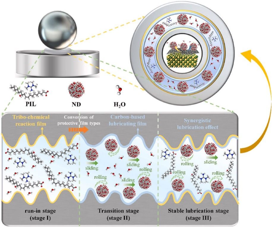 第二篇题为《Study on the evolution mechanism and concentration regulation of dynamic gradient tribofilm in ionic liquid/nanodiamond synergistic lubrication of titanium alloys》(钛合金离子液体/纳米金刚石协同润滑中动态梯度摩擦膜的演化机制及浓度调控研究),由陈国庆博士生作为第一作者。研究聚焦离子液体与纳米金刚石在钛合金润滑中的协同机制,揭示了浓度调控在多组分润滑体系中的关键作用。结果表明,0.1%离子液体与1.0%纳米金刚石的组合可使摩擦系数下降67.96%,磨损体积降低95.31%。低浓度离子液体优先吸附并形成钛氧化物摩擦化学膜,而纳米金刚石在滚动轴承效应与sp³向sp⟡结构转化作用下构筑碳基润滑膜,实现摩擦膜从"摩擦化学膜主导"到"碳基润滑膜主导"的动态梯度演化。