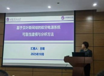 王瑶副教授发表了“基于贝叶斯网络的航空电源系统可靠性建模与分析方法”的演讲。她创新性地提出了三态贝叶斯网络模型,通过引入“物理故障”与“功能损失”状态,有效解决了传统方法存在的组合爆炸与静态分析问题,显著提高了模型的可操作性和计算效率。